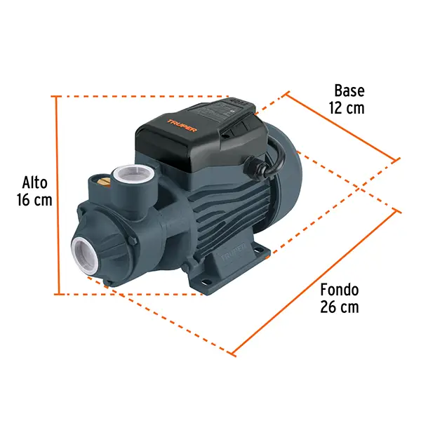 Compacta y ligera, con un peso de 4.5 kg y dimensiones de 12 × 16 × 26 cm, esta bomba periférica facilita la instalación en espacios reducidos sin sacrificar potencia. Su grado de protección IPX4 la resguarda contra salpicaduras, lo que incrementa su durabilidad en entornos exigentes.