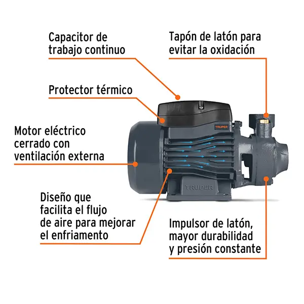 Equipada con un motor de 1/2 HP y embobinado de aluminio, ofrece un consumo eficiente de energía y un desempeño estable. Su impulsor de latón garantiza resistencia al desgaste y un flujo constante de hasta 40 litros por minuto. Además, su ciclo de trabajo controlado asegura un funcionamiento seguro: 25 minutos de operación seguidos por 15 de descanso, con un máximo de seis horas diarias.