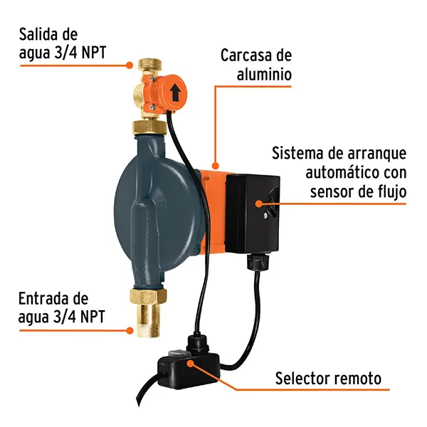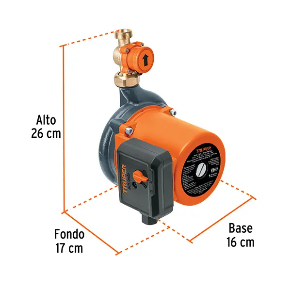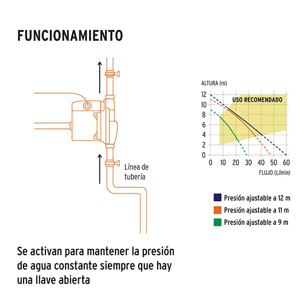 La bomba está diseñada para un uso seguro y confiable en el hogar. Soporta temperaturas de agua de hasta 80 °C, integra un ciclo de trabajo de 50 minutos por 20 de descanso y un máximo de 6 horas diarias, lo que prolonga su vida útil. Asimismo, su peso ligero y dimensiones reducidas facilitan la instalación en espacios limitados.