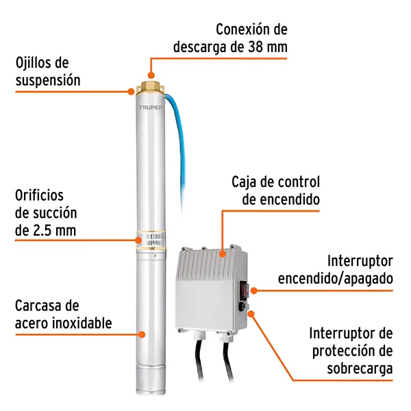 Incluye caja de control con clavija para un manejo práctico y seguro, optimizando la instalación y puesta en marcha. En conjunto, esta bomba sumergible representa una opción ideal para agricultores y profesionales que requieren un equipo robusto, eficiente y con capacidad para operar en condiciones intensivas.