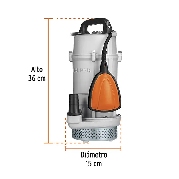 Bomba sumergible Truper de 3/4HP para agua limpia, ideal para cisternas, fuentes y albercas, con caudal máximo de 108 L/min y altura de bombeo de 26 m.