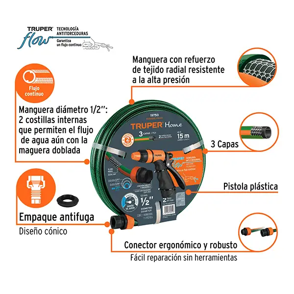 Gracias a su tecnología de refuerzo radial y sus 2 costillas internas, la manguera mantiene un flujo constante incluso cuando se dobla, evitando interrupciones durante el uso. Además, cuenta con conexiones plásticas ergonómicas, resistentes y fáciles de acoplar, lo que garantiza una experiencia cómoda y segura.