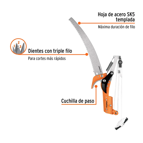 A diferencia de otras herramientas similares, este cortador sin mango ofrece una gran versatilidad, ya que es compatible con mangos telescópicos Truper, permitiendo adaptarse a diferentes alturas y tipos de trabajo. De este modo, se facilita el acceso a zonas elevadas o de difícil alcance sin necesidad de escaleras, optimizando el tiempo y reduciendo riesgos.