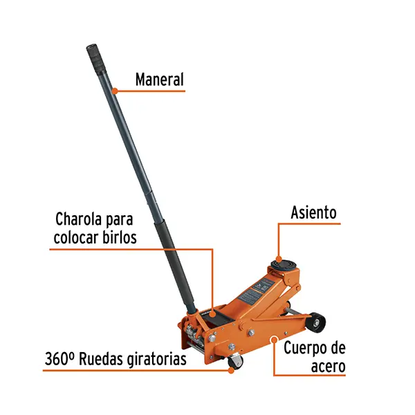 Este gato hidráulico profesional cuenta con una válvula de seguridad integrada, que evita la sobrecarga y garantiza operaciones seguras en todo momento. Además, su maneral de control preciso facilita el levantamiento y descenso del vehículo con suavidad, mientras que las ruedas giratorias aseguran una movilidad fluida y un posicionamiento exacto debajo del chasis.