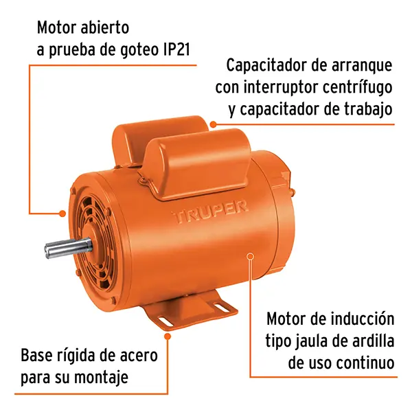 La protección IP21 ofrece resistencia frente a goteos accidentales, mientras que el aislamiento Clase F y el factor de servicio 1.15 optimizan el rendimiento térmico. Con una velocidad constante de 1.725 RPM y compatibilidad de voltaje dual (115 V / 230 V), este motor destaca por su equilibrio entre potencia y eficiencia. Truper garantiza una operación continua, eficiente y segura, adaptada a las necesidades del sector industrial moderno.