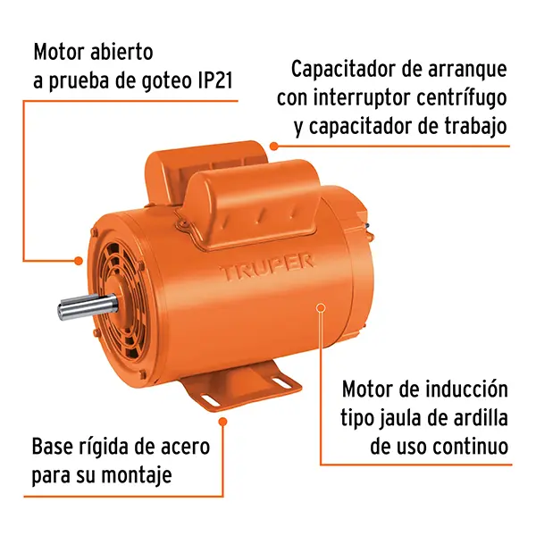 El aislamiento clase F permite soportar altas temperaturas sin comprometer la eficiencia eléctrica, y su factor de servicio 1.15 garantiza un margen adicional de potencia bajo condiciones exigentes. En conjunto, este motor Truper representa una solución confiable, duradera y eficiente para entornos industriales que demandan fuerza continua y bajo mantenimiento.