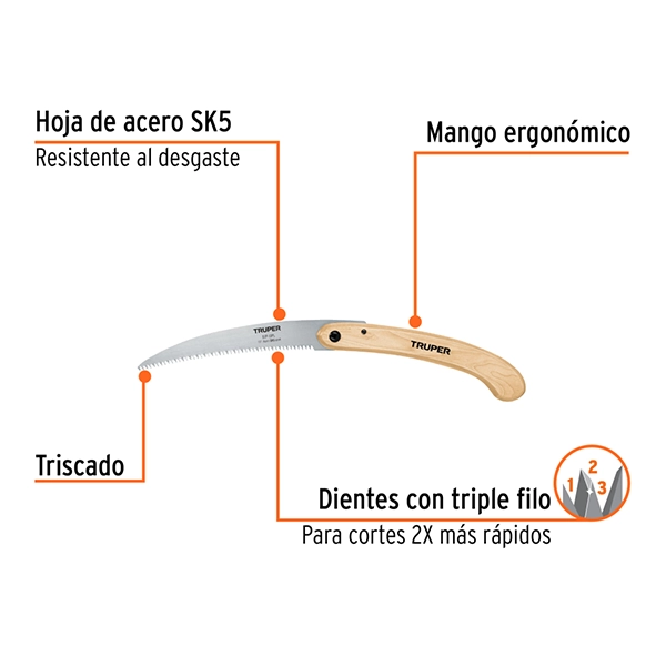 Especificaciones técnicas de Serrucho de Poda 12″ con Mango de Madera Truper